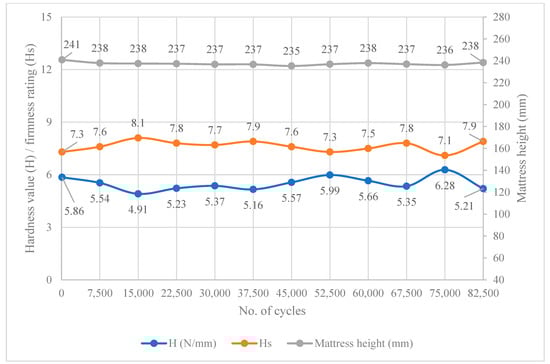The hardness value (H) fluctuated slightly but generally decreased with an increase in the number of cycles. It starts at 5.86 N/mm and ends at 5.21 N/mm, with some variations between cycles. The hardness value exhibited some variability, with peaks at certain cycles (e.g., 4.91 at 15,000 cycles and 5.96 at 45,000 cycles). This variability may indicate the response of mattress materials (inner pocket springs and polyurethane foam) to cyclic loading and unloading. At 30,000 cycles (i.e., the end of the standardized procedure), the values of H and the Hs are 5.37 N/mm and 7.7, respectively. These values were also very close to the final values achieved by the mattress at 82,500. Similar to the case of PUR, this may indicate that 30,000 cycles are sufficient to assess the main characteristics of the mattress.