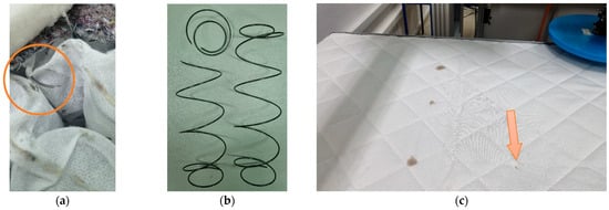 (a) Core of the mattress at the point of breakage (broken spring is circled), (b) broken and whole spring, (c) location of damage on mattress surface.