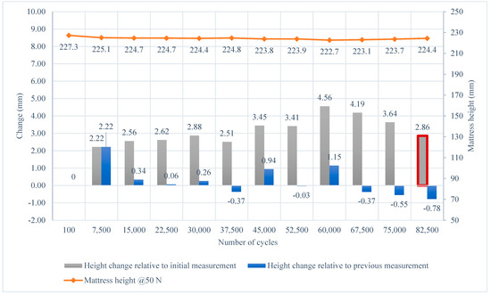 Initially, the mattress height increases, reaching a maximum change of 4.56 mm at 60,000 cycles. Beyond 60,000 cycles, the height change begins to decrease slightly, ending at 2.86 mm at 82,500 cycles. The initial increase in height suggests that mattress materials may expand or settle into a more stable configuration under cyclic loading.