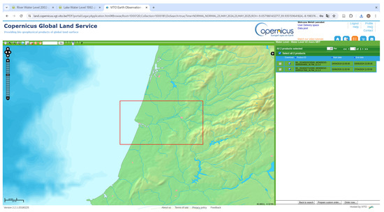 Meteorological data from Open-Meteo were utilised to gather rainfall information for Coimbra from 2000 to 2024, from https://open-meteo.com/en/docs/historical-weather-api (accessed on 28 October 2024). The “Copernicus Land Global Service” (CLMS) portfolio from https://land.copernicus.eu/en/products/water-bodies/water-level-rivers-near-real-time-v2.0 (accessed on 28 October 2024) was selected for the Mondego river water height. Access to the CLMS platform required an account, through which data could be collected by selecting the specific region.