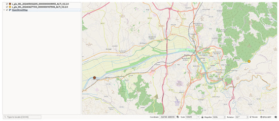 Two dataset points for this area were found for the Mondego river. They were plotted with their location with an OSM map in QGIS, as seen in Figure 4. The higher altitude point is closer to the Coimbra city centre, and therefore, it was chosen for hydrological connectivity. The other point is at a lower altitude and closer to the ocean.