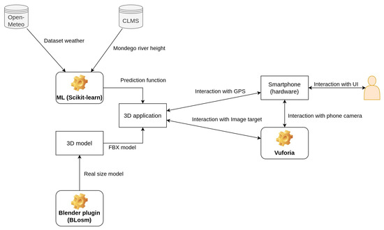 For the 3D model, correction, processing and 3D application, a custom methodology and experiment were conducted. The ML component used the dataset to learn and generate predictive models, which were then combined with the 3D real-sized model in the 3D application. This application communicated with Vuforia to process the 3D models in the scene. Interaction between the user and the application was performed by a user-friendly interface, allowing interaction with the water plane. Although GPS interaction was included, it was not mandatory to the final project, as it could be disabled and did not conflict with the usability of the main application. The final application with a video demonstration could be found in a GitHub repository: https://github.com/MehdiLamISIB/CoimbraFloodPrevention (accessed on 28 October 2024).