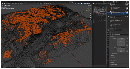 The necessary data for the 3D real-sized model of the city of Coimbra were obtained using a Blender plugin called BLosm, which extracts data from OpenStreetMap. This plugin utilises predefined rules to generate 3D structures such as buildings, areas and roads from OSM data, assigning appropriate colours to each component with respect to predefined rules from OSM as available in this link: https://wiki.openstreetmap.org/wiki/Simple_3D_Buildings (accessed on 28 October 2024). BLosm added a new panel in Blender, allowing users to select the desired area and specify options for extracting specific elements. Figure 6 shows a screenshot taken from Blender.