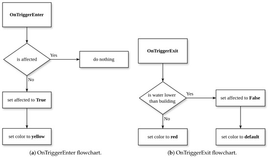 In the conditional diagram in Figure 7, these two functions are called individually and the use of the variable “affected” avoids some unnecessary repetition by playing with them. The height comparison is performed between the building’s centroid and the water plane’s centroid using Unity Transform. Three colours, , , and , are used to display the status of a building, defined as follows: