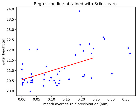 Figure 9 shows the scatter plot of water river height and the rain at the same year and month, along with the regression line calculated. The correlation between the two variables is stronger in low rain precipitation and initial water height. The divergence and spread of values are higher after the value of 0.15 mm of monthly average rain. Some outstanding points may be caused by water management at a dam that is located upstream in the river (Aguieira dam). This dam manages water retention according to the needs for electricity production along the year.