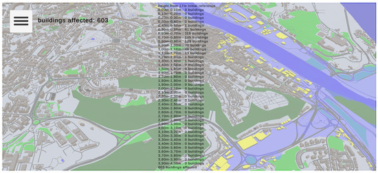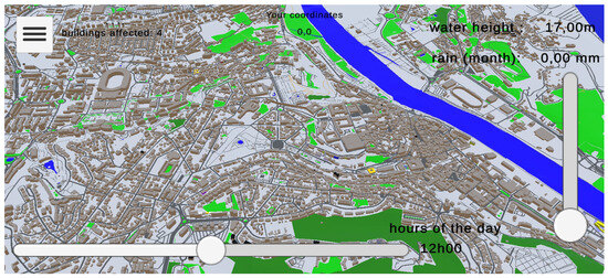 Figure 10 shows the user input menu, where rain and time can be configured. Figure 11 shows a scenario where buildings affected by floods are listed and marked in yellow colour on the map. The river water height can be obtained by moving a slider representing the value of the monthly average rain precipitation.