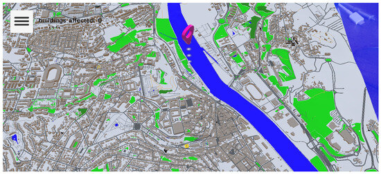Mid-quality/High-quality 3D model data for the city of Coimbra obtained through BLosm plugin were used to create the real scaled model of the city of Coimbra. The area of Coimbra used in the application is a rectangular region of 4.8 × 5.4 , rather than the actual real border of the region of the municipality. This region was chosen to be manageable for a mobile application while still being sufficiently large for studying impacted buildings along the river front.
