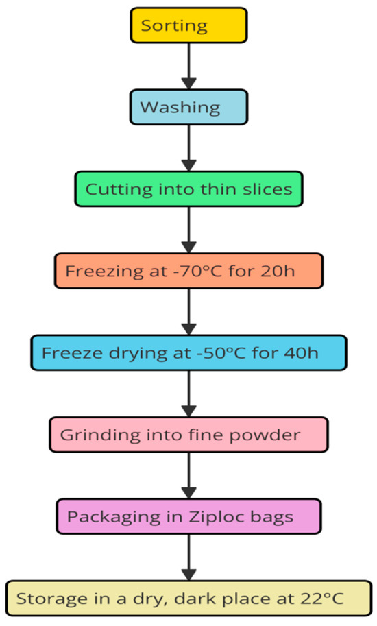 Fresh carrots and pumpkins were pre-treated (sorting, washing) and then cut into thin slices and dried in the laboratory vacuum freeze dryer Chaist Alpha 1-2 LD (Christ/Sigma, Osterode, Germany). Frozen samples (at −70 °C for 20 h) were placed in the freeze dryer, and the drying step was carried out at a pressure of 0.04 mbar at a temperature of −50 °C for 40 h. The dried carrots and pumpkins were ground into a fine powder using the multifunction device Thermomix MT31, Vorwerk (Wuppertal, Germany). The resulting powder was tightly placed in Ziplock foil bags intended for freezing food products, and stored in a dry, dark place at room temperature (22 °C) until further use (Figure 1).