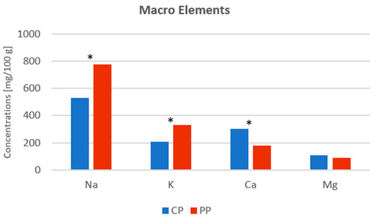 The content of individual macro minerals in vegetable powders. Abbreviations: Na—sodium, K—potassium, Ca—calcium, Mg—magnesium, CP—carrot powder, PP—pumpkin powder. Means with * is significantly different at p < 0.05.