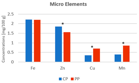 The content of individual macro minerals in vegetable powders. Abbreviations: Fe—iron, Zn—zinc, Cu—copper, Mn—manganese, CP—carrot powder, PP—pumpkin powder. Means with * is significantly different at p < 0.05.