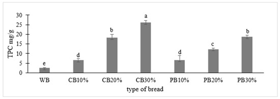 Total phenolic content (TPC) in each type of bread. Abbreviations: WB—wheat bread, CB10/20/30%—bread with 10/20/30% addition of carrot powder, PB10/20/30—bread with 10/20/30% addition of pumpkin powder. Means with different letters (a, b, c, d, e) are significantly different at p < 0.05. Means a, b, c, d, e specify differences between the total phenolic content (TPC) of wheat bread and bread enriched with 10, 20, and 30% CP and PP.
