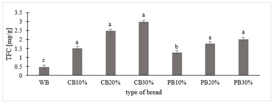 Total flavonoid content (TFC) in each type of bread. Abbreviations: WB—wheat bread, CB10/20/30%—bread with 10/20/30% addition of carrot powder, PB10/20/30—bread with 10/20/30% addition of pumpkin powder. Means with different letters (a, b, c) are significantly different at p < 0.05. Means a, b, c specify differences between the total flavonoid content (TFC) of wheat bread and breads enriched with 10, 20, and 30% carrot and pumpkin powder.