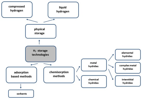 The storage technologies for hydrogen presented schematically in Figure 2 can be categorised into the following three main types: