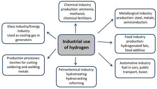 Poland has a great potential to use hydrogen, as it is currently the third producer of this gas in the European Union and fifth in the world. This hydrogen is almost exclusively (95%) non-renewable hydrogen, so-called grey hydrogen, produced by the most common and most inexpensive method, mainly from natural gas in the process of steam methane reforming by refineries and chemical plants. The largest hydrogen producers in Poland are Grupa Orlen (Płock, Poland), Grupa Azoty S.A. (Tarnów, Poland), and Jastrzębska Spółka Węglowa (Jastrzębie-Zdrój, Poland). The produced hydrogen is practically entirely used for industry (chemical, petrochemical, metallurgical) and the food sector (Figure 4), and only a small part is traded on the market.