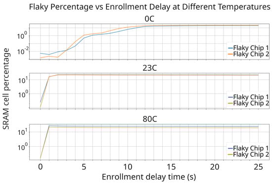 Flakiness vs. enrollment delay time over different temperatures. The two flaky chips shown have no major differences in temperature or enrollment time. The SRAM chips used in this study use a similar enrollment cycle time of 1, 3, or 21 s since there is very little variation from chip to chip.