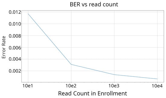 By increasing the number of reads, the likelihood of identifying a cell as flaky increases, resulting in a reduction in the number of stable cells available. To assess the impact of the read count, we conducted enrollments with progressively higher read counts. These enrollments were then used to generate a key, and the corresponding BER was measured. The results of this analysis are presented in Figure 8.