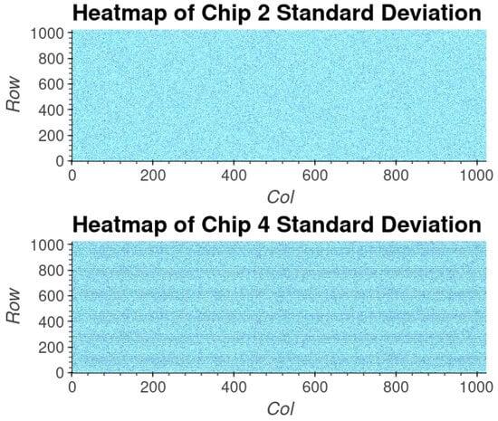 A heatmap of the cell response’s standard deviation of the calculated temperature. The cell’s standard deviation across all three temperatures was calculated to present a pixel in the heatmap. The standard deviation shows a striation pattern for chip 4; however, this pattern does not appear in the mean response. Before use as a PUF, the SRAM needs to be tested for any patterning within the chip.