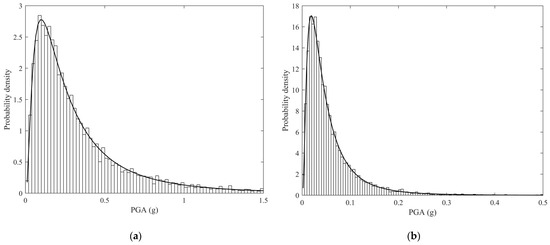 Furthermore, the stochastic approach utilized in this study effectively models the probability distribution of PGA as a lognormal distribution, in agreement with findings from [45], which suggest that peak values of strong motion parameters are likely to follow a lognormal distribution. Figure 7 demonstrates that the PGAs from the artificial earthquakes generated in this study also exhibit this lognormal behavior. It supports the accuracy of the lognormal fittings applied and further illustrates the effectiveness of the stochastic approach for predicting PGA behavior in seismic analysis. By validating the model’s ability to generate reliable PGA probability distributions, the evidence underscores the robustness of the proposed method in accurately capturing realistic seismic behavior patterns.
