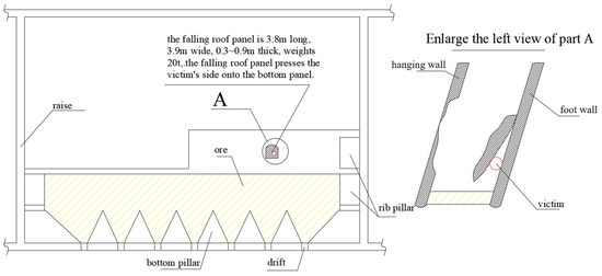 The safety of mining operations is paramount. As a method of mining, the shrinkage method requires workers to enter the stope to operate, but it is easy to cause surrounding rock collapse accidents after blasting, which significantly increases the safety risk of workers. For example, on 6 July 2022, a roof fall accident occurred at the Guangyuan Sunping Gold Mine due to the use of the shrinkage method. The main cause of the accident was the excessive height of the exposed walls of the hanging wall and the foot wall, which was unstable during mining using the shrinkage method, resulting in a 20-tonne rock measuring 3.8 m × 3.9 m × (0.3 to 0.9) m sliding off the hanging wall and crushing the victim under the rock of the foot wall of the mine. The accident eventually resulted in one death and a direct economic loss of 1.5 million RMB. A schematic diagram of the scene after the accident is shown in Figure 4. It is important to emphasize that this risk increases with the depth of mining [2].
