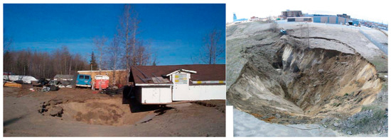 In addition to the safety hazards of personnel operating in the stope, the overall collapse of the stope is also a serious problem. The ore pillars retained by the shrinkage method to support the stope and the surrounding rock experience decreasing strength under long-term creep and groundwater, and the pillars undergo continuous instability or a sudden roof fall, while generating surge and shock gases; these bring great safety hazards to personnel, equipment, facilities, buildings, etc., and can even cause earthquakes and surface subsidence [57,58]. For example, the use of the mine shrinkage method in the Wa mine in New Zealand left an open area, which eventually caused a surface collapse [59]. In Canada, the Hollinger and McIntyre mines used cut-and-fill and the shrinkage method to mine a series of parallel, narrow and steeply dipping gold veins in the Porcupine–Destor Fault. The Hollinger Mine ceased operations in 1968 and the McIntyre Mine ceased operations in 1989. However, as recently as 1999, a series of subsidences (sinkholes) occurred at different locations in the mining area, particularly on the surface near the goaf that was created as a result of ore recovery by the shrinkage method. As the years went by, the subsidences had an impact on numerous properties, especially near the intersection of Highway 101–655 (Figure 5) [60]. In China, the Shirengou Gold Mine is a major example. In the Shirengou Gold Mine in China, a collapse of a mine void created by the shrinkage method occurred, with the goaf created by the shrinkage method collapsing from the top −210 m level to the −165 m level, with a collapse height of 45 m [58].