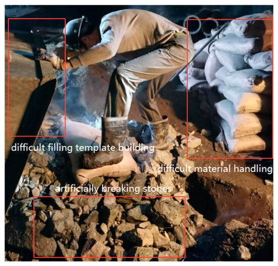 In the process of using the shrinkage method in Suichang Gold Mine, due to the high ore grade, in order to improve the recovery rate, the shrinkage method first adopts concrete replacement pillars, and then mining rooms, which leads to the complexity of the mining process and low efficiency. At the same time, the current use of concrete pillars construction of manual labor intensity is extremely high, with extremely low efficiency, and the concrete replacement ore pillar cost is extremely high (see Figure 6). The use of pneumatic rock drills and electric rakes in production has resulted in low mining efficiency, which is only able to reach a production capacity of 30 t/d. The primary dilution rate of mining is as high as 40%, while there is a secondary dilution rate of up to 5%.