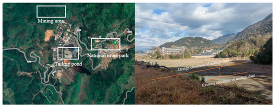 Due to the long-term use of the shrinkage method to recover ore, a large number of goafs have been formed underground. In the vicinity of the mine, there are a large number of residential areas and a National Mine Park (see Figure 7). The development of these goafs over time may lead to surface subsidence, posing a great safety hazard. In addition, the shrinkage method does not use the large amount of tailings generated after beneficiation for backfilling in the goaf. As shown in Figure 7, the tailings pond of the Suichang Gold Mine is close to the design elevation, and the tailings pond is a major source of danger, according to China’s “Opinions on Further Strengthening Work Safety”; once the tailings pond reaches the design elevation, the mine must be closed and production stopped, which means that the mine is facing the dilemma of suspending production. Therefore, Suichang Gold Mine plans to use tailings to form a backfill, treat the original goaf and the existing goaf mined by the shrinkage method, and transform the existing mining method into an upward horizontal layered filling method.
