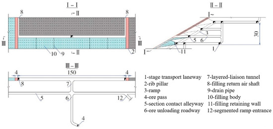 Mechanized upward horizontal layered filling method. I-I is the front view of the mining method, II-II is the left view of the mining method, and III-III is the top view of the mining method.
