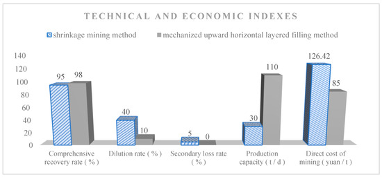 A comparison of mining technical and economic indicators between the Suichang Gold Mine shrinkage method and the mechanized horizontal layered filling method is shown in Figure 9.