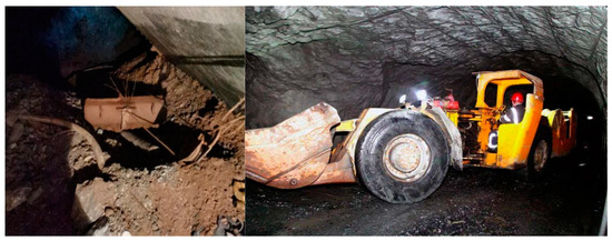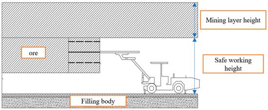 The stability of the ore rock in the test section is extremely poor, and the shrinkage method is very prone to produce the disaster of falling and unstable collapse, which jeopardizes the safety of the operators. The upward horizontal layered filling method adopts the technology of horizontal drilling with a drill jumbo and downward ore-dropping (as shown in Figure 13), and the mechanized supporting equipment of an LHD, which has a higher mining efficiency, a very short exposure time of the mining area, and makes it easy to deal with the upper loose rock, and the maximum height of the empty roof is small, which makes the safety of the mining operation greatly improved.