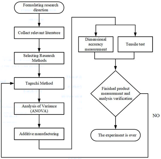 Based on the aforementioned literature, research has only focused on individual outcomes. Compared to Refs. [,,], they only study the mechanical properties of 3D printed products. Nowadays, the applications of 3D printing are extensive, so the dimensional accuracy of the finished products is certainly important. Therefore, this study investigates two experimental objectives: dimensional accuracy and Tensile strength, in order to obtain the optimal set of printing process parameters.