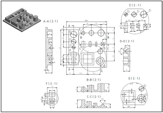Various studies designed different experimental models to analyze the printing quality of FDM [,,]. This study of dimensional accuracy experiment based on the circle’s outer diameter, the length, and width of the rectangle, the circular hole, the rectangular groove, thickness, and tip height, as shown in Figure 2. The experimental model in this study, as shown in Figure 1, features 40 measured dimensions, including circular outer diameter, rectangular length and width, circular holes, rectangular slots, thickness, and tip height, as listed in Table 1.