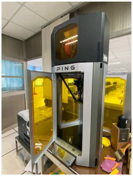 The Additive manufacturing used in this experiment was DUAL300, produced by Linkin Factory Co., Ltd. (Taoyuan City, Taiwan), and the material is polylactic acid (PLA). The water absorption, quality, degradation, and color may induce inaccurate test data. This is due to external variables during printing or experiments. These external variables included the fineness and quality of the end products or the strength calculation during the impact test. The slicing software uses PING SlicerV2.1 as the control software. The processing parameters were set up through the software, and the model sample was converted into G-code for model printing. The printer’s appearance is shown in Figure 4.