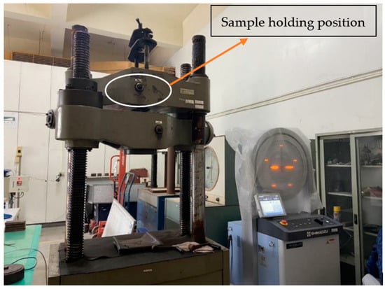 The prepared sample of standard specifications was put in a universal testing machine that can pull, press, and bend, as shown in Figure 5. After fixing the sample, a pulling force was applied to both ends until it breaks. The tensile test aims to test the strength and ductility of the material. The proportional limit, elastic limit, yield point, yield strength, tensile strength, elongation, and reduction of material area is obtained. When the load exceeds the yield point, the elongation increases greatly as the load increases, and the diameter decreases uniformly until the load increases to the ultimate stress. If the load of the ultimate stress is divided by the original cross-sectional area, the material’s tensile strength can be obtained. The unit is generally MPa, and the tensile strength is expressed as Equation (1):