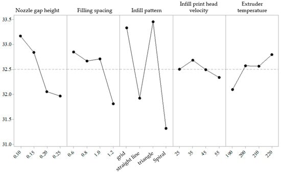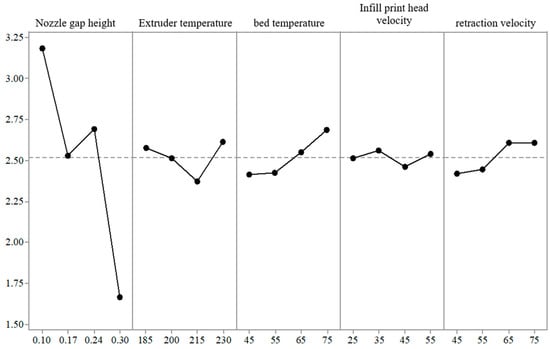Table 8 is the response table of the factors to the maximum tensile strength of the print and Figure 7 is the response graph of the factors to the maximum tensile strength of the print. Among them, experimental error in tensile strength is ±10%, and this data is provided by the manufacturer. Regarding the latter-the-better quality characteristic, a larger S/N ratio represents a better quality characteristic. According to Table 8, the optimal factor level combination is A1 B1 C3 D2 E4. Specifically, the nozzle gap height of 0.1 mm, fill spacing of 0.6 mm, infill pattern triangle, infill print head velocity of 35 mm/s, and extruder temperature of 220 °C.