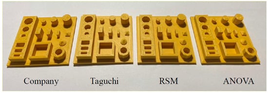 Three experiments were conducted with the Taguchi experimental method, response surface method, and single factor experiment to verify the optimal parameter combination. The set parameters are shown in Table 23. The experimental results are analyzed in Table 24. Figure 10 is a printed model of dimensional accuracy. Although the model appears the same in Figure 10, the measurement results of the dimensions are different.