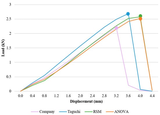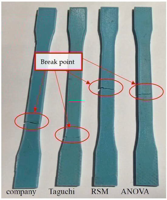 Three experiments were conducted with the Taguchi experimental method, response surface method, and single factor experiment to verify the optimal parameter combination. The set parameters are shown in Table 25. The experimental results are analyzed in Table 26. The experimental error is the ratio of the maximum tensile strength to the theoretical value of 60 MPa for PLA material []. The stress-strain diagram of the tensile test is shown in Figure 11. It can be seen that the parameter combinations obtained from the Taguchi experiment for printing models can withstand larger loads. The tensile test model is shown in Figure 12. After conducting the tensile test, data on its tensile strength was collected. Additionally, it is evident that the fracture points differ with various parameter combinations. Perhaps further research can be conducted on this to analyze whether the printing parameters are related to the fracture locations.