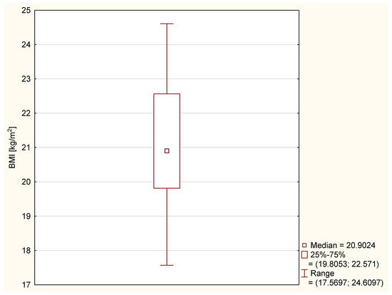 The BMI in the surveyed group significantly differed between women and men (Z = 2.054, p = 0.04). The average BMI for the whole group was 20.9 (Figure 1). Analyzing the group of medallists without sex divisions, a normal distribution of BMIs was found.