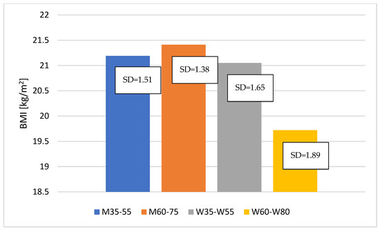 BMI for men was 21.5 (SD = 1.43) and 20.4 (SD = 1.74) for women. Lower BMI values were observed in the women’s group, and the SD for the BMI results in the women’s group was higher than in the men’s group. BMI was also compared among age subgroups (Figure 2). The lowest values were observed in the group of older women (M = 19.72 kg/m2). No major differences were observed between the remaining subgroups.