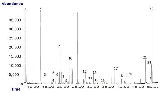 Chromatogram (TIC) of oleaster oil. Peaks: 1, ethanol; 2, hexanal; 3, isoamylacetate; 4, D-limonene; 5, 1-pentanol; 6, 2-pentylfuran; 7, β-cis-ocimene; 8, hexylacetate; 9, cis-3-hexenylacetate; 10, trans-2-heptenal; 11, nonanal; 12, acetic acid; 13, benzaldehyde; 14, trans-2-nonenal; 15, β-linalool; 16, 2-butyrolactone; 17, α-farnesene; 18, butanoic acid; 19, guaiacol; 20, 2-phenylethanol; 21, m-cresol; 22, nonanoic acid; 23, p-vinylguaiacol.