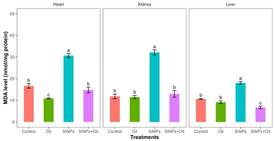 MDA levels with different treatments in the three organs: liver, kidney, and heart. Error bars represent the standard error. Matching letters above the bars denote no significant difference at p ≤ 0.05 following Tukey’s post hoc test (see Supplementary Material).