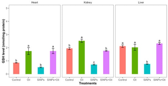 Reductions in glutathione activity showed highly significant differences among the four treatments in liver, kidney, and heart (F3, 24 = 30.14, df = 3, p < 0.0001; F3, 24 = 89.51, df = 3, p < 0.0001; F3, 24 = 14.49, df = 3, p < 0.0001, respectively). GHS levels between the control group and the different SiNP-exposed groups showed statistically significant differences in liver and kidney, but not heart (Table S2, Figure 4). The assessment of all pairwise combinations using the Tukey contrast test (Table S2) revealed that there was a significant difference between rats injected with SiNPs and treated with oil and the rats injected with SiNPs and not treated. The GSH level was higher in the treatment where the rats injected with nanoparticle and treated with oil in the three organs compared to those injected with SiNPs and not treated. In the liver and kidney, there was no significant change in GSH levels between rats injected with SiNPs and treated with oil and the control group. There was no significant difference in GSH between the control group and the groups treated with oil in liver, but there were significant differences in kidney and heart.