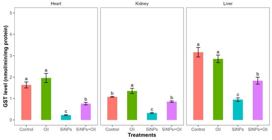 GST levels with different treatments in the three organs: liver, kidney, and heart. Error bars represent the standard error. Matching letters above the bars denote no significant difference at p ≤ 0.05 following Tukey’s post hoc test (see Supplementary Material).