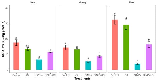 SOD levels in different treatments in the three organs: liver, kidney, and heart. Error bars represent the standard error. Matching letters above the bars denote no significant difference at p ≤ 0.05 following Tukey’s post hoc test (see Supplementary Material).