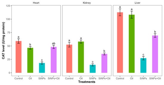 Catalase levels showed highly significant differences among the four treatments in liver, kidney, and heart (F3, 24 = 58.35, df = 3, p < 0.0001; F3, 24 = 41.03, df = 3, p < 0.0001; F3, 24 = 32.23, df = 3, p < 0.0001, respectively). CAT levels differed significantly between the control group and the different SiNP-exposed groups in liver, kidney, and heart (Table S5, Figure 7). Tukey post hoc analysis (Table S5) of CAT levels indicated that there was a significant difference between rats injected with SiNPs and treated with oil and rats injected with SiNPs and not treated in the three organs.