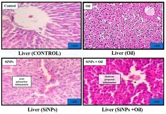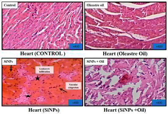 Malondialdehyde assays showed highly significant differences between the control, liver, kidney, and heart (F3, 24 = 77.64, df = 3, p < 0.0001; F3, 24 = 72.09, df = 3, p < 0.0001; F3, 24 = 77.98, df = 3, p < 0.0001, respectively). MDA levels in the control group and the different nanoparticle (SiNP)-exposed groups for liver, kidney, and heart showed statistically significant differences (Table S1, Figure 3). Notably, there was a significant difference between rats injected with SiNPs and treated with oil and rats injected with SiNPs and not treated.