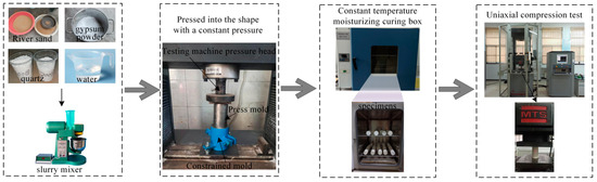 In order to simulate the structural characteristics of sandstone under geological deposition, this study used a WDW-50 electro-hydraulic servo testing machine to exert a constant load on the upper surface of the specimen after initial setting and press it into the shape in a constrained mold as illustrated in Figure 2. The specific production steps are outlined as follows: