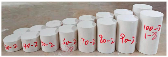 - Cut and polish the prepared specimens into eight groups of cylindrical specimens with a diameter of 50 mm and a height of 30 mm, 40 mm, 50 mm, 60 mm, 70 mm, 80 mm, 90 mm, and 100 mm in different HDRs, as shown in Figure 3; in total, 80 rock-like specimens were produced.