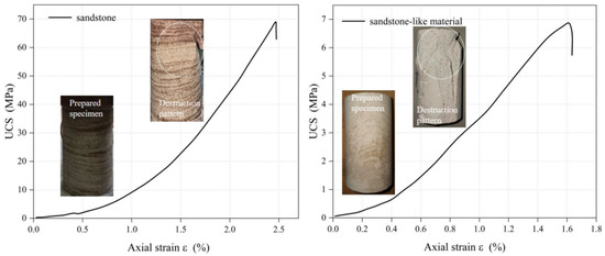 The sandstone-like specimens were polished to a size of φ50 × 100 mm, after which a uniaxial compression experiment was also performed at a LR of 0.5 MPa·s−1. The results showed that the average of UCS was 6.96 MPa. In contrast, the UCS of sandstone is 69.2 MPa, revealing a difference between the two is approximately ten times. The difference in density between the two is approximately two times. As is shown by the stress–strain curves Figure 4, the stress–strain curves were fitted, and the slope of the fitted straight line was taken as an approximate value for the elastic modulus. The slopes of the two fitted straight lines are similar and the goodness of fit approaches 1, suggesting that the elastic moduli of both materials are comparable. The failure characteristics and mechanical properties between sandstone and sandstone-like specimens are very similar, with a similar proportional relationship. The mechanical properties are shown in Table 2. This proves that it is feasible to use this kind of sandstone-like material to simulate sandstone [41].