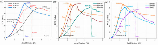 Stress–strain curves of specimens with different HDR. (a) HDRs of 0.6–1; (b) HDRs of 1.2–1.6; (c) HDRs of 1.6–2.