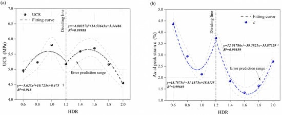 Figure 6a illustrates that as the HDR increases, the UCS value displays a changing trend that is M shaped. The curve is fitted by two parts with a HDR of 0.6~1.2 and 1.2~2, and the fitting parameter is good, R2 is 0.918 and 0.99988, respectively in order to obtain the fitted Formula (3) for the UCS at each stage. When the HDR ranges from 0.6 to 1.2, the UCS roughly tends to first increase fast and then decrease slowly. The maximum UCS, 5.8 MPa, during this stage is obtained when the HDR is 1. After passing the dividing line of a HDR of 1.2, the UCS curve shows a trend of first fast growth then reducing significantly. And the maximum value of the UCS, 5.69 MPa, in this interval is obtained at a HDR of 1.6. Additionally the UCS has a small error prediction range, indicating it is low dispersion. Therefore, within the HDR range of 0.6~2, UCS presents different change trends, and the maximum value is obtained at a HDR of 1. However, the UCS does not completely decrease with the increase in size; when the HDR ranges from 0.6 to 1, the UCS follows an increasing trend. This is not consistent with previous conclusions that as the size increases, UCS gradually decreases to stabilize [4,6,7,10,31]. However, this result seems to coincide with the conclusions of Hawkins and Masoumi [1,20] that the UCS increases within a certain HDR range and gradually decreases when exceeding this range.
